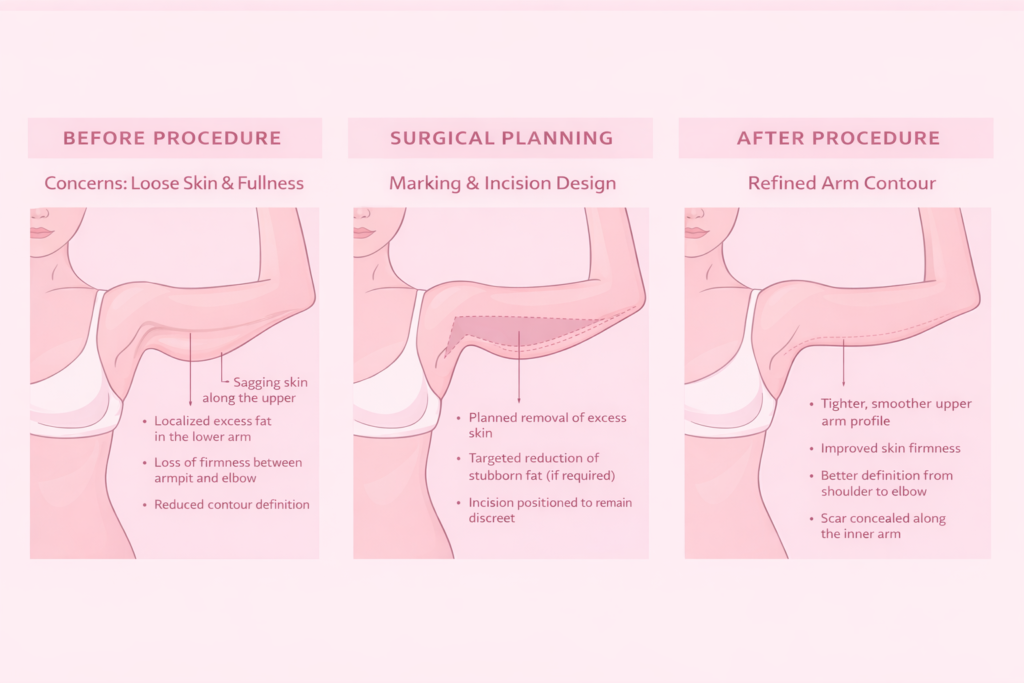 Arm lift surgery corrects loose, hanging skin and resistant fat along the upper arms that do not respond to exercise. By combining excess skin removal in arms with targeted fat refinement, it restores smoother contour affected by ageing, weight changes, or genetic laxity.